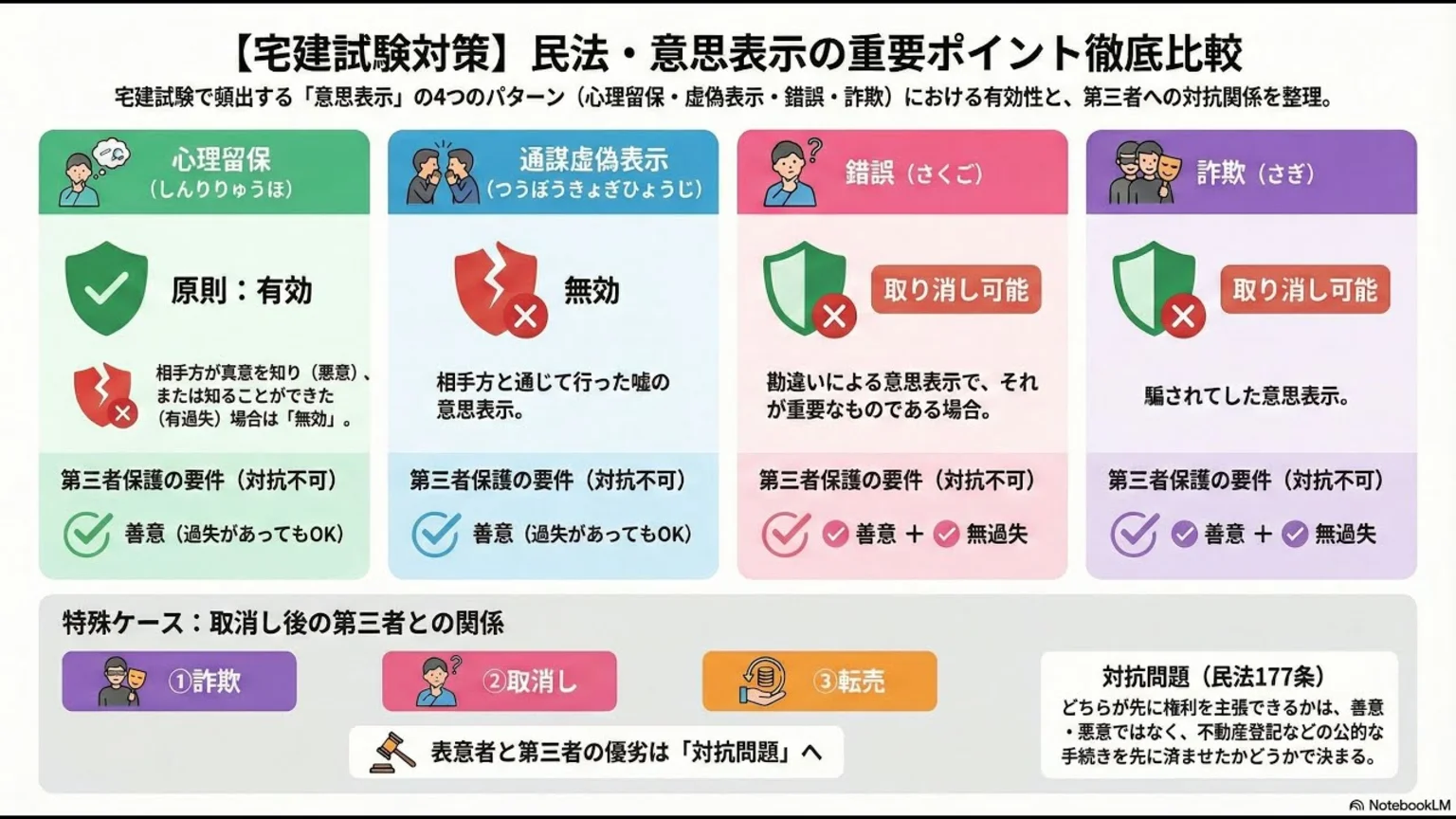 意思表示は民法の基本論点ですが、細かい要件の違いが問われるため、表で整理して覚えることをおすすめします。